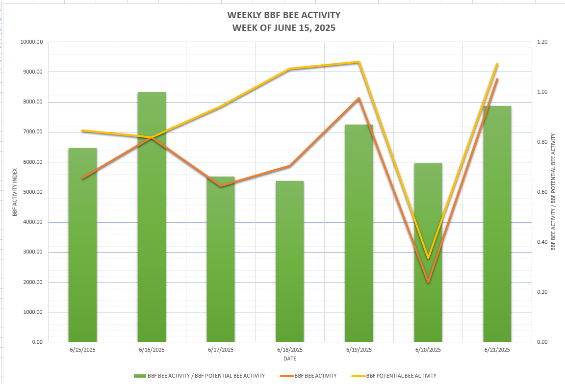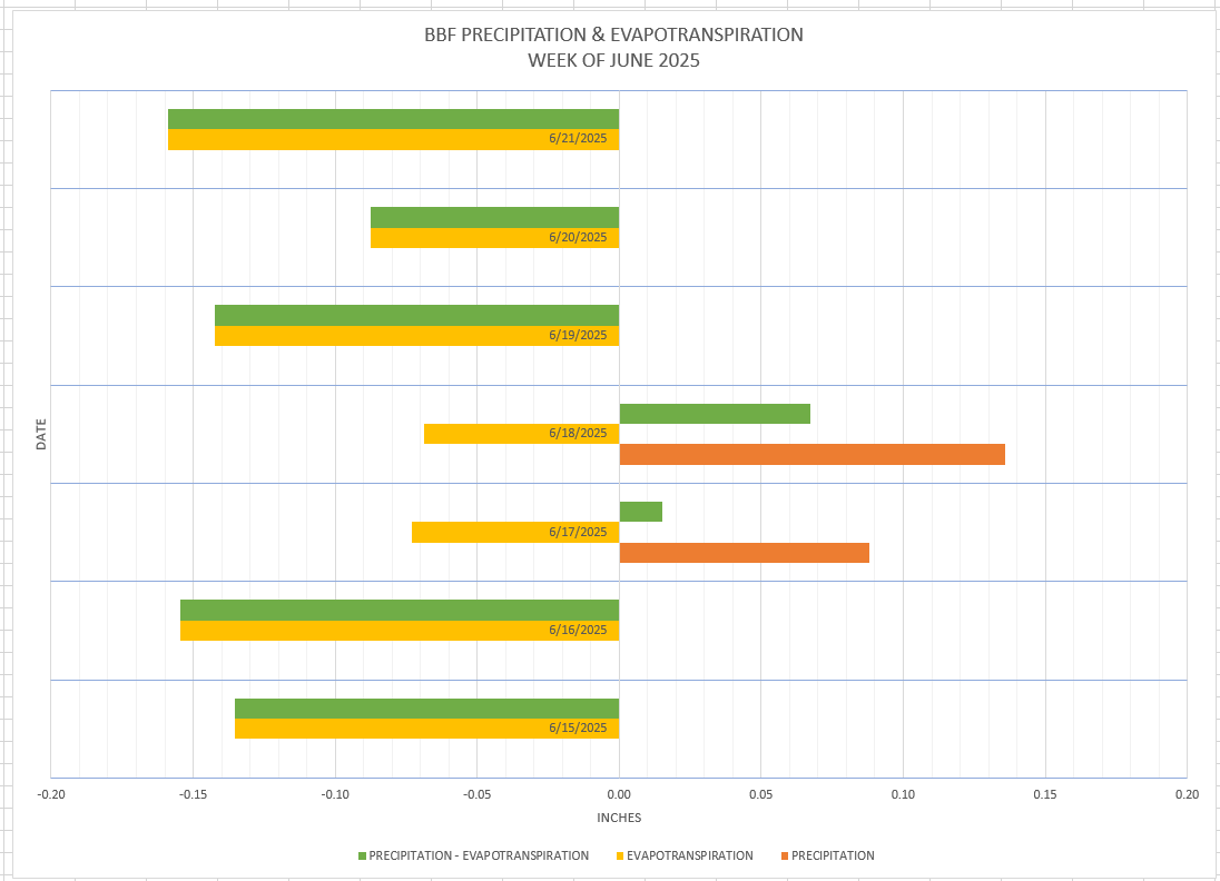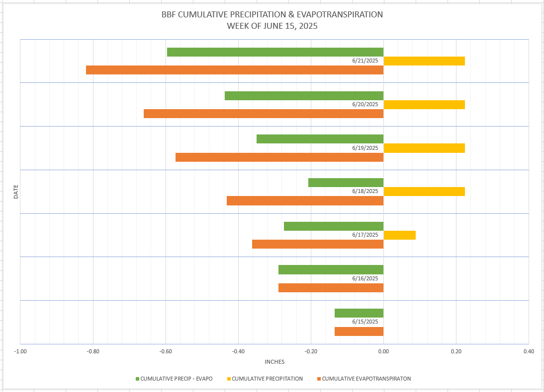This chart shows the amount of precipitation (moisture incoming) to evapotranspiration (moisture outgoing) plotted on a daily basis for the week. If the evapotranspiration exceeds the precipitation value it indicates a negative moisture balance which can effect nectar flow and perhaps the need to provide water to hives.At Black Birch Farm Apiaries we monitor Soil Moisture, Precipitation, and Evapotranspiration to determine moisture stress on both hive activity and nectar flow.
